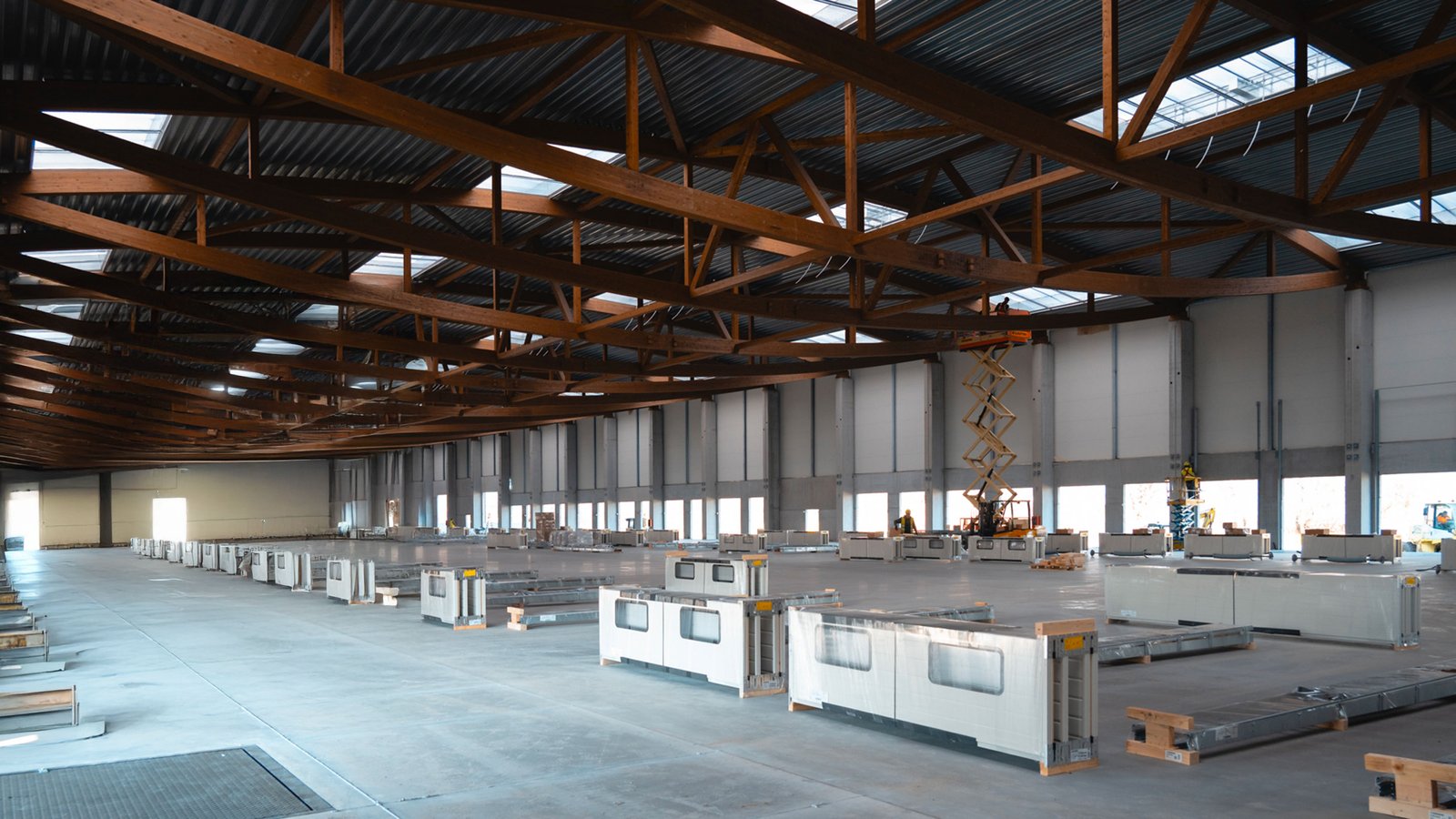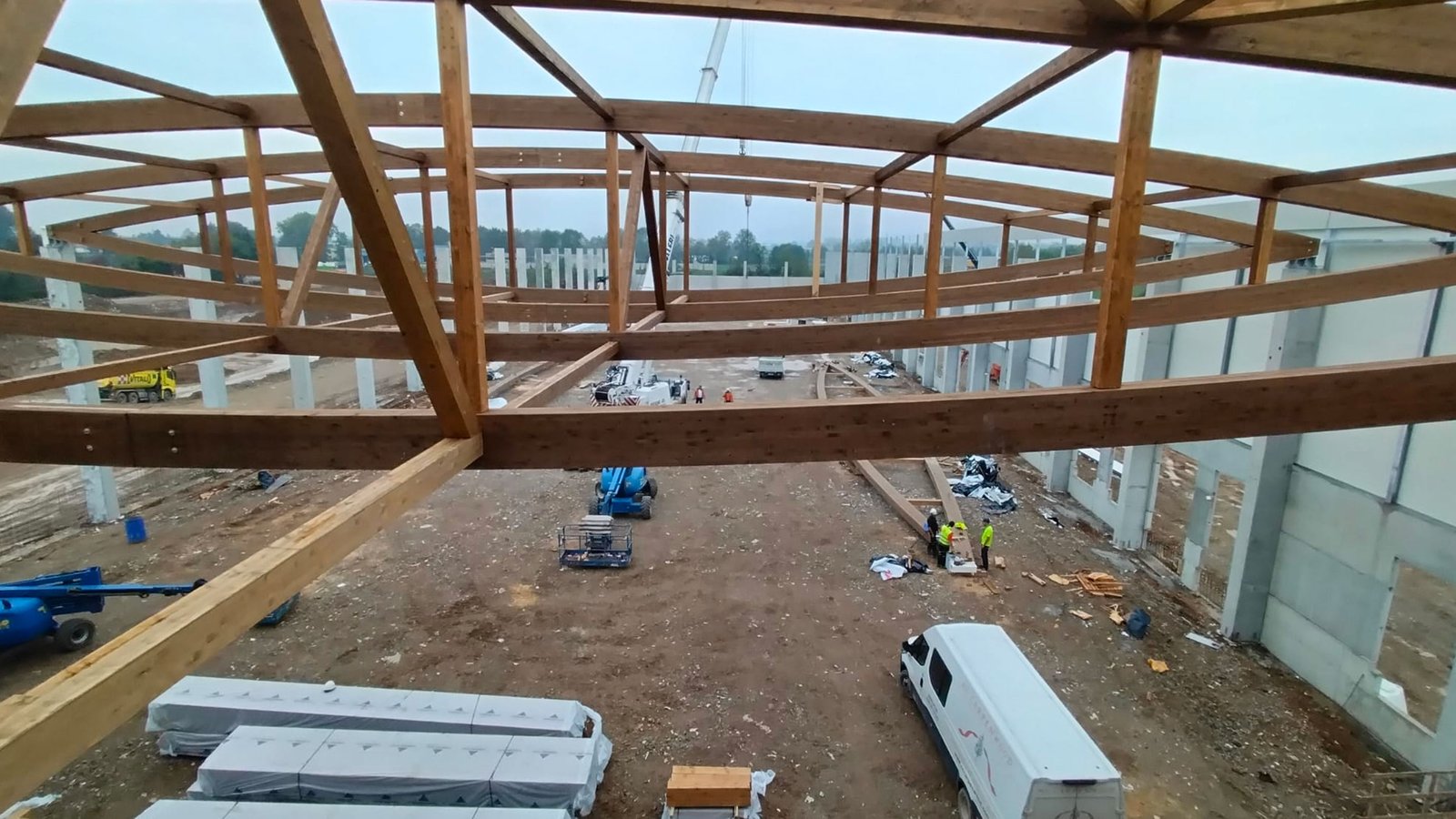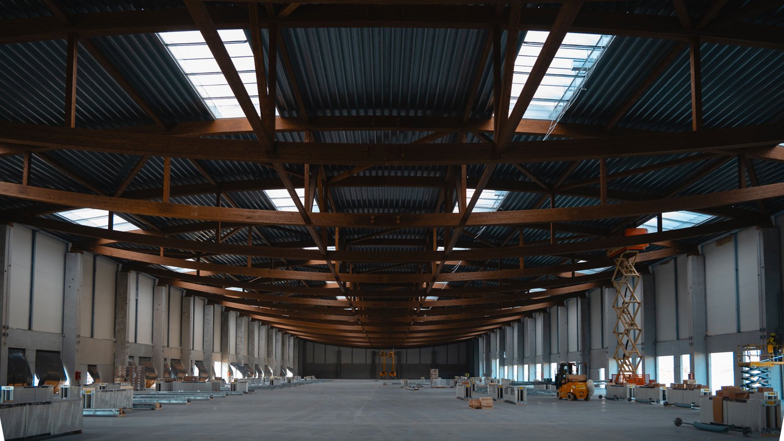 La peculiarità del progetto è rappresentata dal magazzino avente larghezza pari a 45 metri in luce unica per la quale è stato previsto un sistema di travi in legno lamellare lenticolari che donano all’ambiente una caratteristica unica, sia a livello ingegneristico sia a livello di impatto estetico.