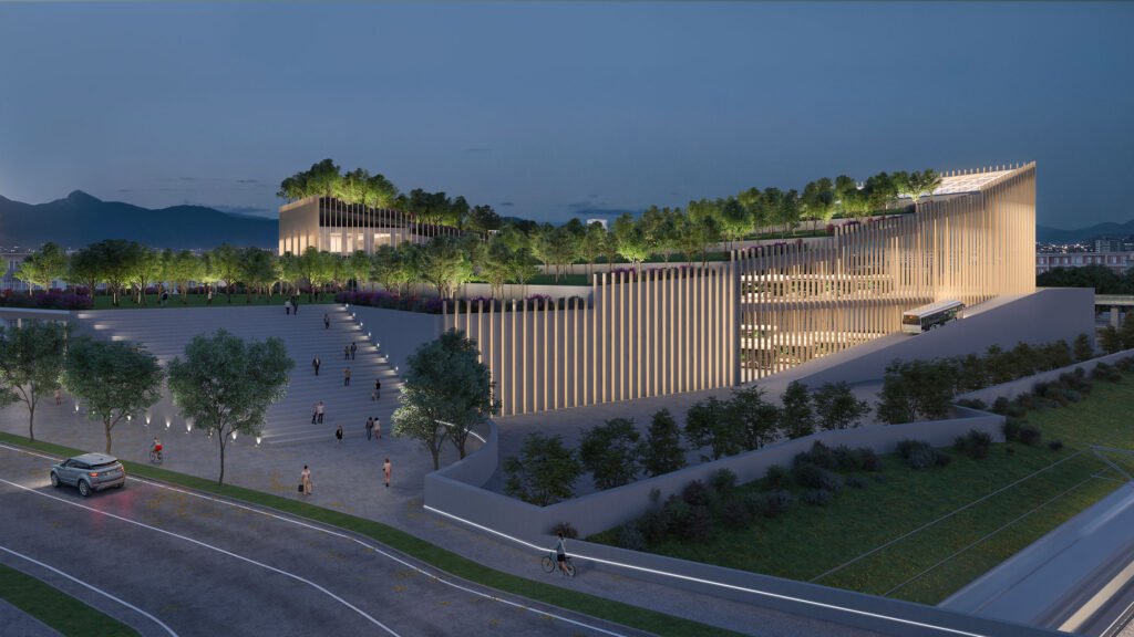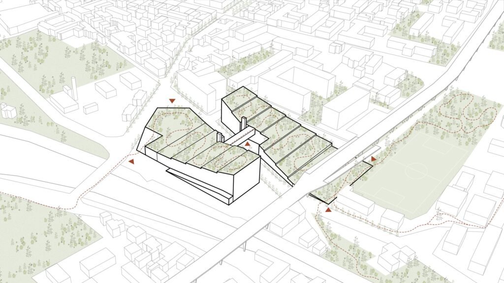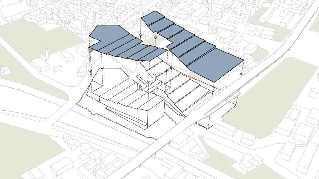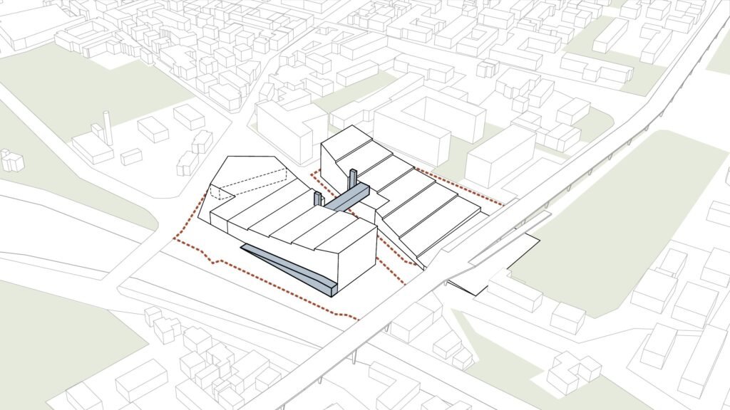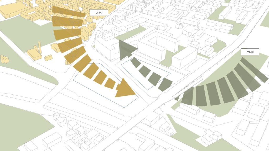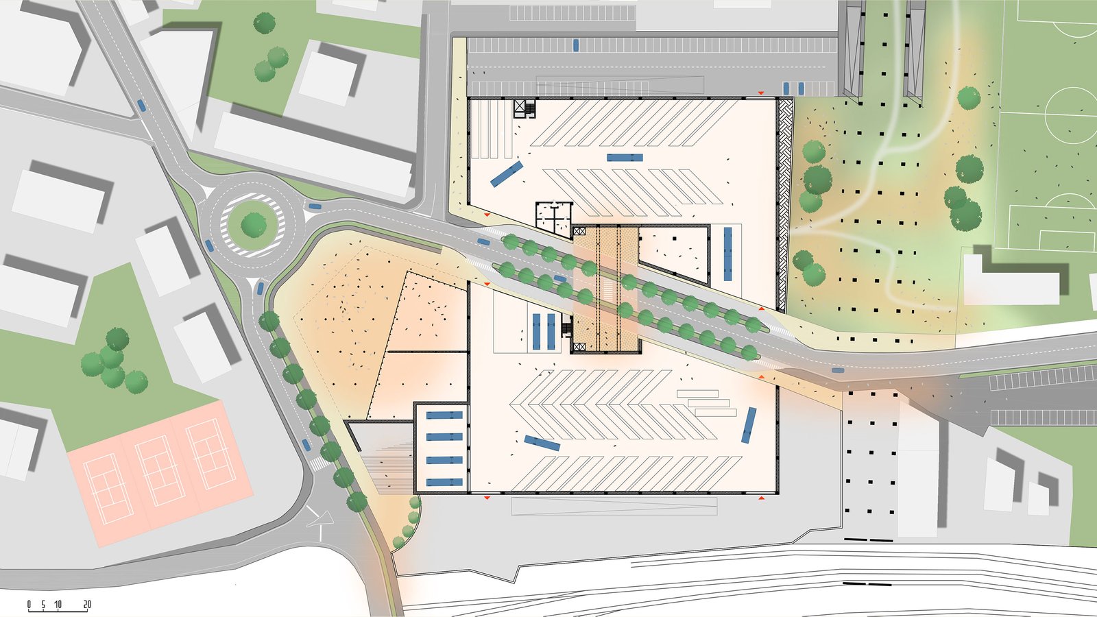 Il concept prevede che il deposito multipiano venga coperto da un parco pubblico a connessione tra quello esistente di Clementina sul lato est e il futuro di porta sud a ovest. Un parco che diventa la connessione tra due aree della città ad oggi degradate con attività che favoriscono l’incontro comunitario, socialità, piste ciclabili, attività di benessere, il tutto godendo di una prospettiva unica su città alta e il resto della città. Un gesto architettonico che regala alla città spazi pubblici di connessione e relazione facendo convivere in maniera rispettosa una funzione invasiva come quella richiesta dal committente, con un edificio a servizio dei quartieri.