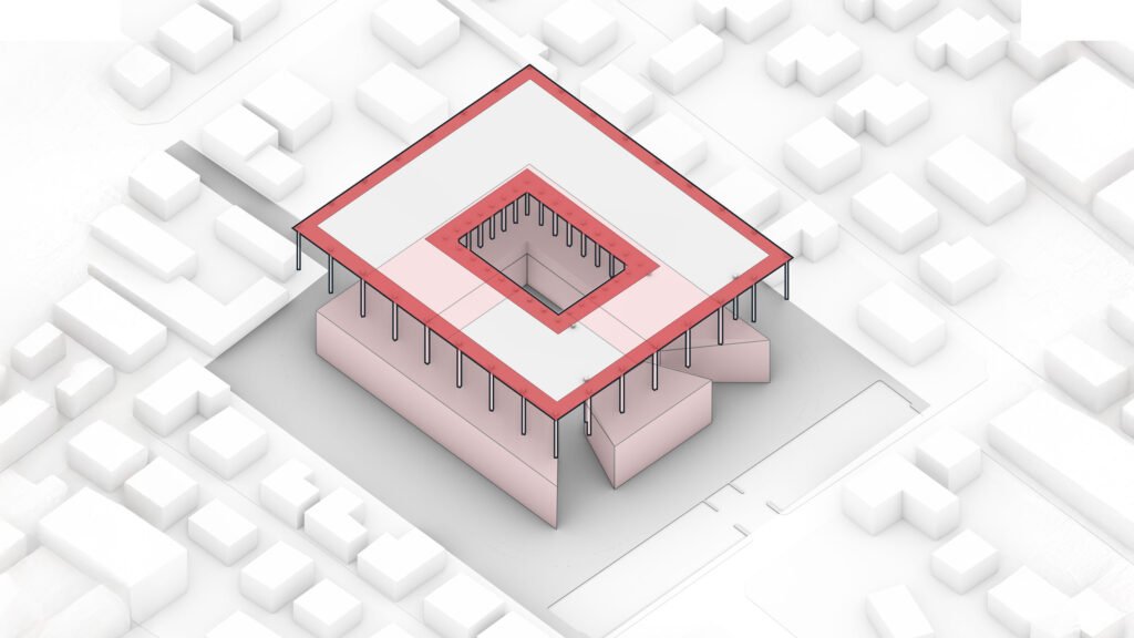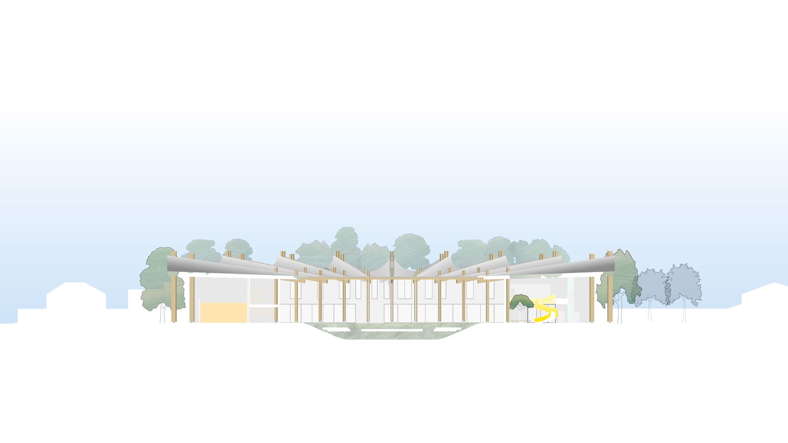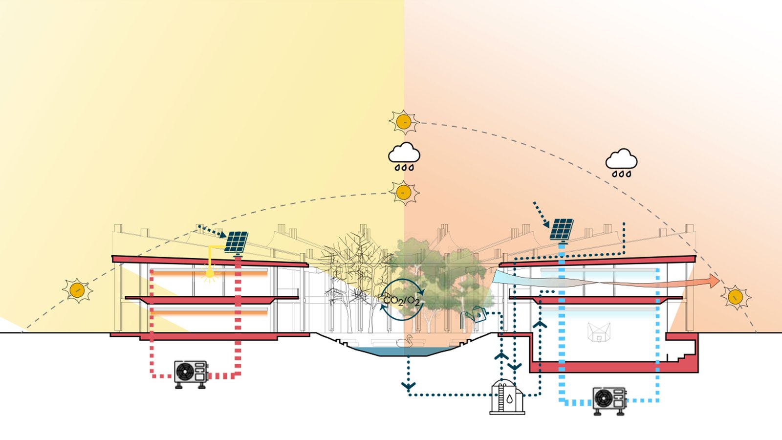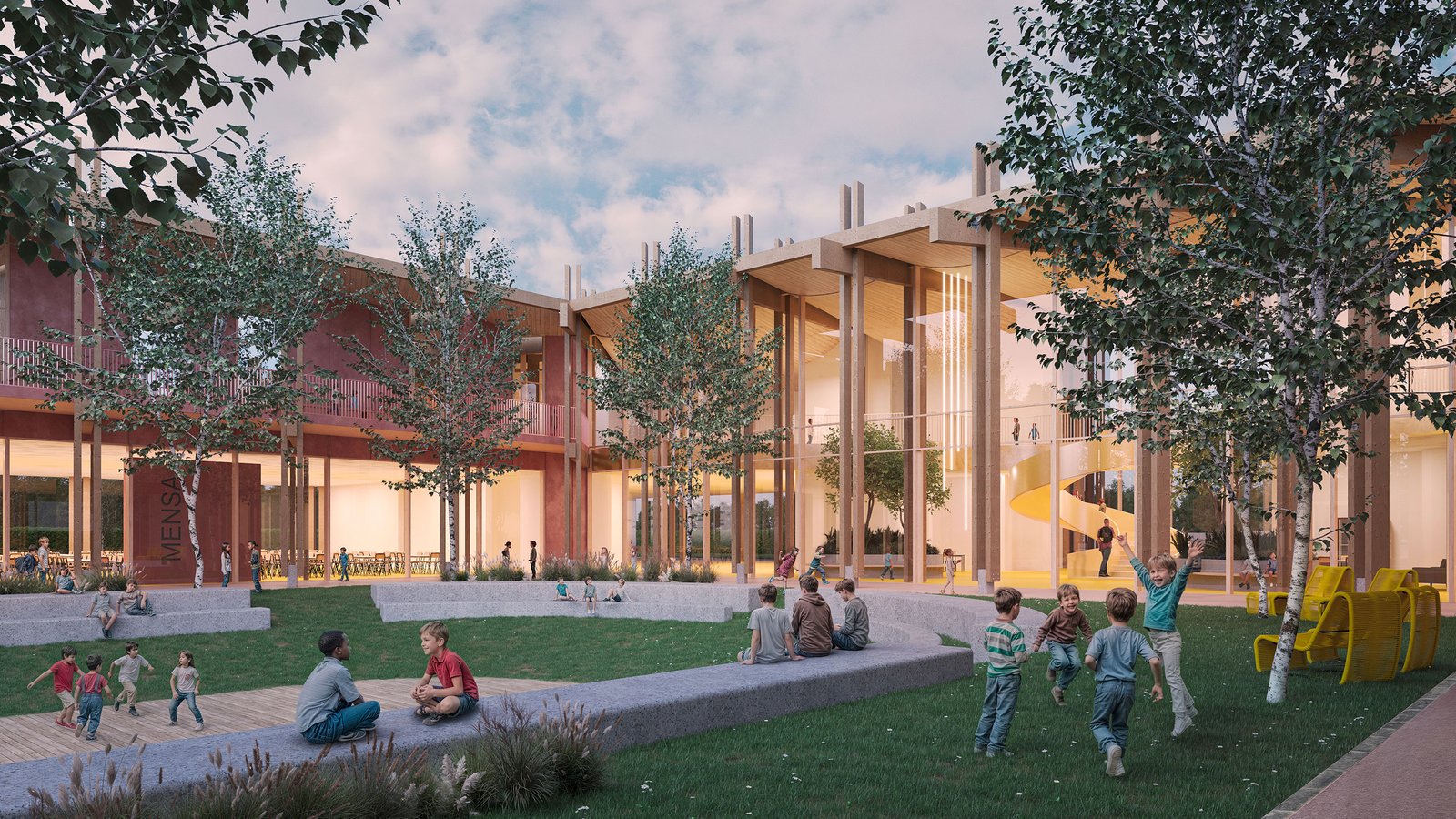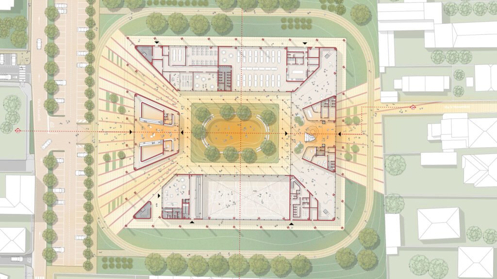 La scuola è concepita come spazio aperto e inclusivo, operativo anche oltre l’orario scolastico grazie a funzioni collettive come biblioteca, palestra, mensa e laboratori, tutte accessibili in modo autonomo. La grande canopy, simbolo architettonico del progetto, unifica gli spazi e funge da luogo di incontro e transizione tra pubblico e privato. L’ambiente scolastico è pensato per stimolare creatività e senso di appartenenza, con aule flessibili, orti didattici e ampi balconi.