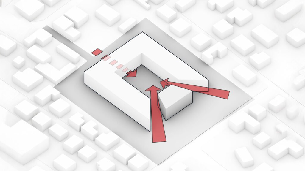 Il progetto propone una scuola primaria pienamente integrata nel contesto urbano, capace di diventare punto di riferimento per il quartiere e per i comuni limitrofi. L’edificio, compatto e ordinato nella pianta, si distingue in alzato grazie a una volumetria articolata e a una matericità ricca, che ne rafforzano la presenza urbana. Il nuovo parco circostante favorisce connessioni pedonali e verdi tra centro storico e aree in espansione, valorizzando l’accessibilità e la fruizione pubblica.